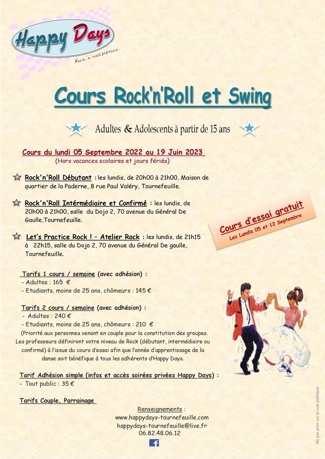 Cours : Les lundis soir à la maison de quartier de la Paderne (8 rue Paul Valéry): Rock débutant de 20 h 00 à 21 h 00. Au dojo 2 (70 avenue du général de Gaulle) : Rock intermédiaire et confirmé de 20 h à 21 h et Let’s Practice Rock- Atelier Rock de 21h15 à 22h15.